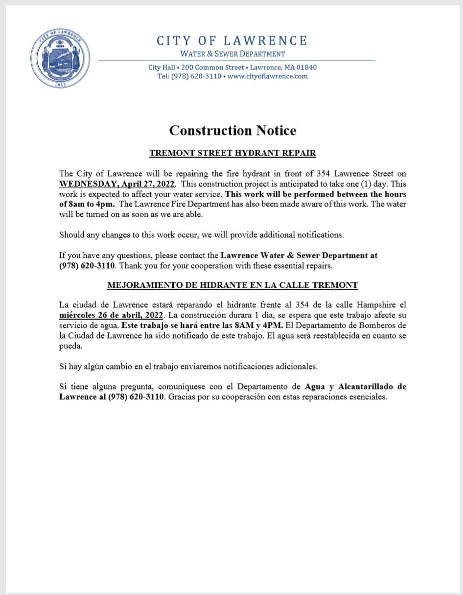 Construction Notice TREMONT STREET HYDRANT REPAIR MEJORAMIENTO DE HIDRANTE EN LA CALLE TREMONT